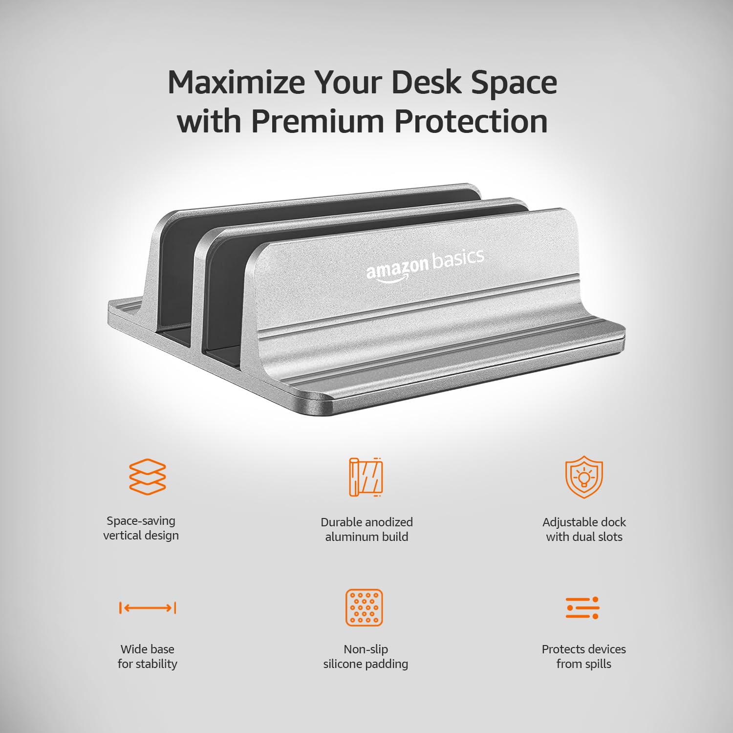Stand to store your laptop vertically, which frees up valuable desk space and protects your device from spills