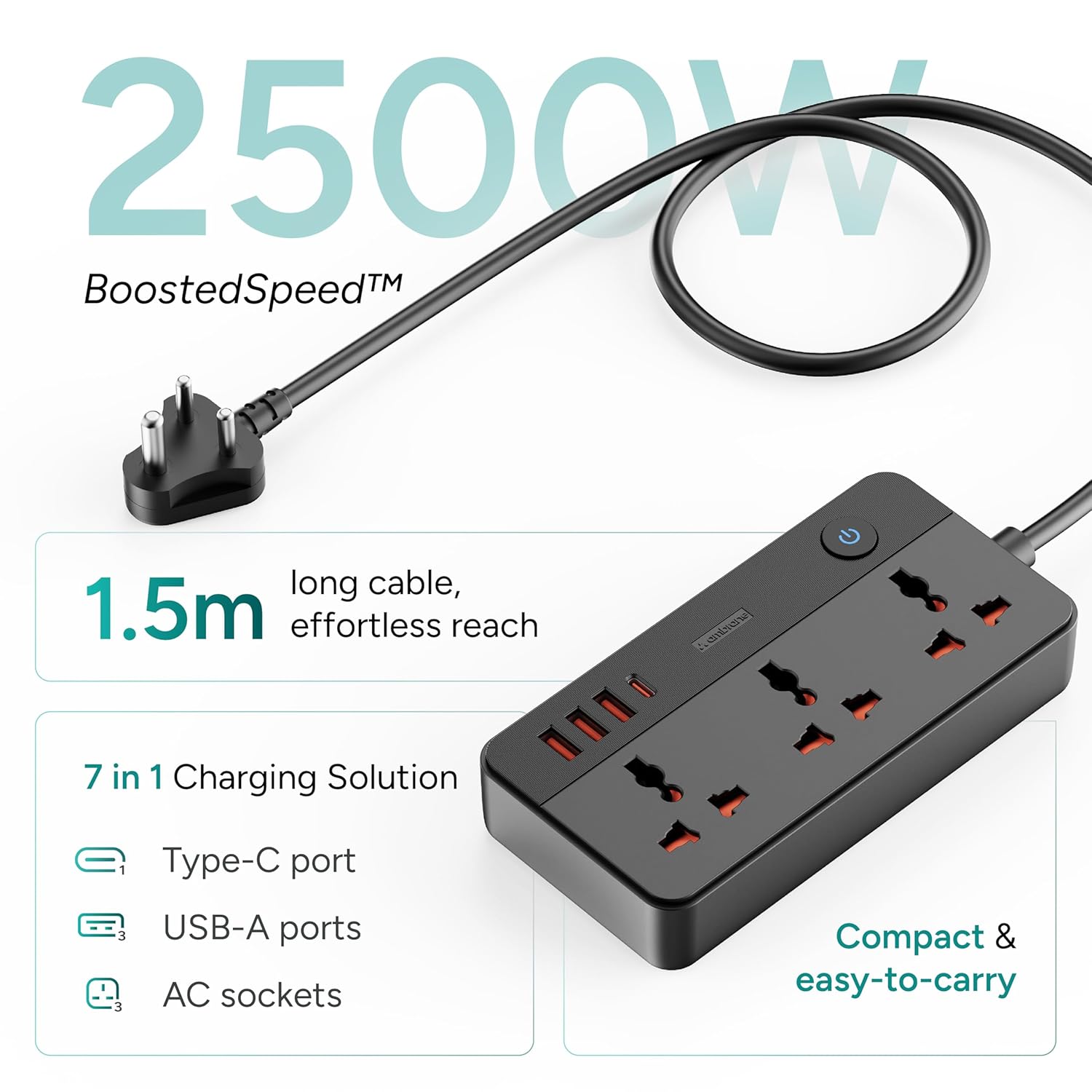 Featuring 3 USB-A ports, 1 Type-C port, and 3 AC sockets, this power strip can charge up to seven devices at once, perfect for both home and on-the-go use.