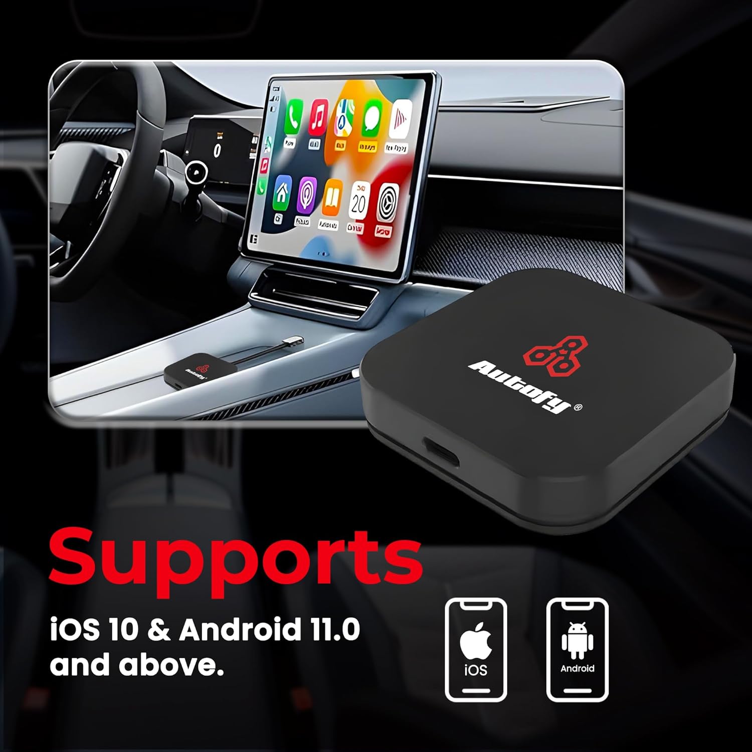 [24 MONTHS W”A”R’R’A”NT”Y – YouTube + Netflix + JioCinema Apps – WIRELESS ADAPTER for APPLE CARPLAY & ANDROID AUTO] – Autofy CP2D Wireless Apple CarPlay & Android Auto Adapter converts your wired setup completely cordless. Enjoy YouTube Netflix JioCinema Apps, Navigation, Calls, Siri, Ok Google, Music playback all without connecting charging cable. Autofy’s wireless adapter car accessory has 60% faster connection & reconnects automatically. Comes with 24 Months w”a”r’r’ant”y”.[60% FAST CONNECTION & AUTO RECONNECT] – powered with Bluetooth 4.2 & 5.8 GHz + 2.4 GHz DUAL Wifi band ensuring your phone stays connected . Autofy’s CP2D wireless carplay adapter car accessory has lightning fast reconnection time. Just plug in the wireless adapter & pair once with your Android or iOS device for a smooth & flawless experience. Enjoy a stable & reliable connection with minimal delays or interruptions, even in challenging environments like underground parking lots etc.[PLUG PLAY DEVICE WITH FAST DETECTION & WORKS WITH ALL DEFAULT CAR BUTTONS] – When car engine is turned ON, powerful chip inside quickly starts adapter & 5.8GHz Wifi detects your phone even if it is in your bag, pocket etc. Autofy’s CP2D allows you to use steering mounted buttons, voice control, touch screen, knob operations like all OEM features. No Apps / System Drivers needed. Please ensure your phone forgets Bluetooth/WiFi connections with the car’s infotainment system before starting.[COMPATIBILITY] – CP2D works with most car models having factory fitted wired Android Auto OR Apple CarPlay. CP2D supports iOS 10 & Android 11.0 and above. Connect with our awesome customer support team if you face any issue during setup (Details mentioned on MRP Label & Product Manual both). CP2D Might not work with some aftermarket stereos hence we suggest to connect with us in case of setup issues.[HIGH PERFORMANCE LOW LATENCY] – upgrade from wired Carplay & Android auto to a fully wireless one. Reduce charging cable, charging port wear & tear and have a wire free experience. This car interior accessory has powerful Quad Core A53 chip to ensure minimal lags giving you high performance during rides. Enjoy low latency navigations, music playback & more with Autofy’s CP2D wireless adapter. Autofy’s Wireless Adapter runs on Android 12 with 2GB RAM & 16GB internal storage.