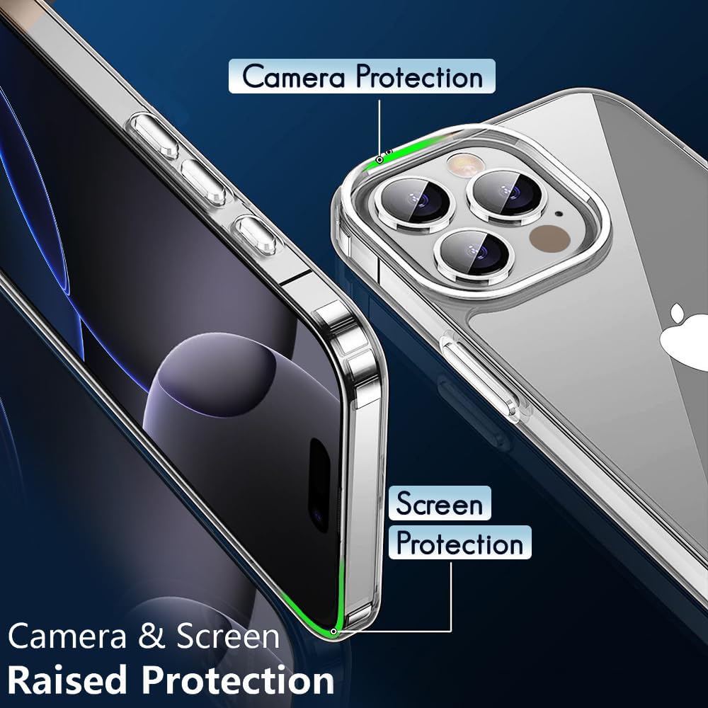 Clear case has a higher lip around the rear camera which will prevent it from touching a flat surface when placed face down. Because this case build with a double-cushioned structure provides 2X shockproof, including 4-corner upgraded invisible Flex-cushion and a reinforced soft buffer TPU bumper, which can disperse 98% of the impact