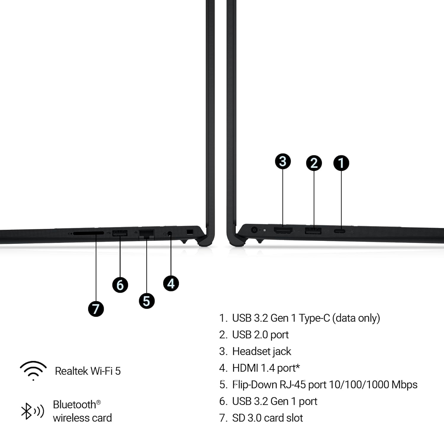 Ports: 1 USB 2.0 port, 1 Headset jack, 1 HDMI 1.4 port*, 1 Flip-Down RJ-45 port 10/100/1000 Mbps, 1 SD 3.0 card slot, 1 USB 3.2 Gen 1 port, USB 3.2 Gen 1 Type-C (data only)