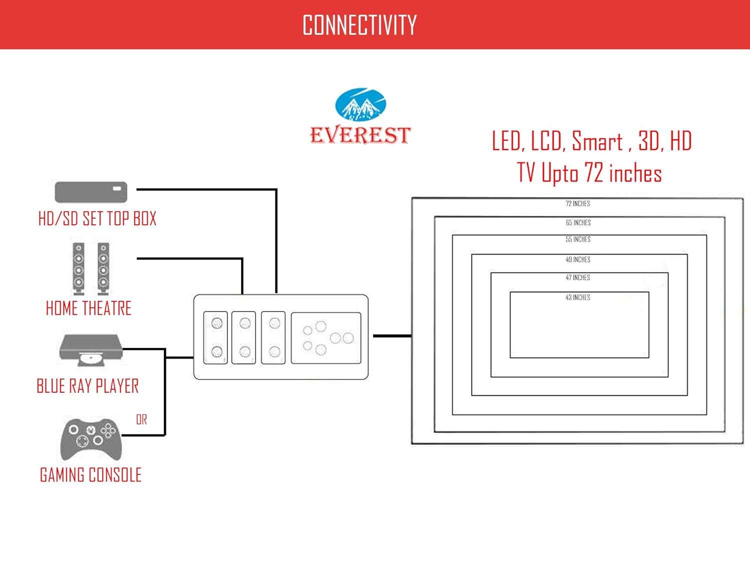 Everest ECC 100 Led stabilizer is suitable for 32/43/55/72 inchs Tv with 4 plug point. Its also support for Set top box, home theatre, gaming console and blu-ray player